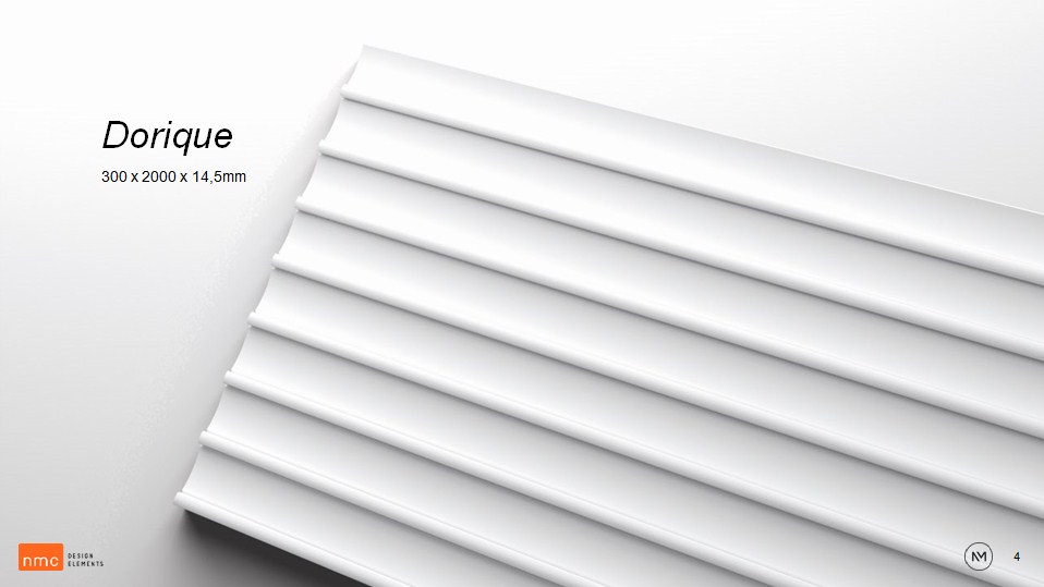 Стеновая панель NMC DORIQUE, созданная дизайнером Бертраном Лежоли, представляет собой новую интерпретацию классического узора, идеально вписывающуюся в современный интерьер. Полосы света и тени, чередующиеся вдоль вертикальных линий, создают игру контрастов и сложную геометрию. Эту 3D-панель можно использовать в сочетании с молдингами NMC FL11 и NMC WL10, а также с стеновыми панелями Canele S и L для создания уникальной композиции.