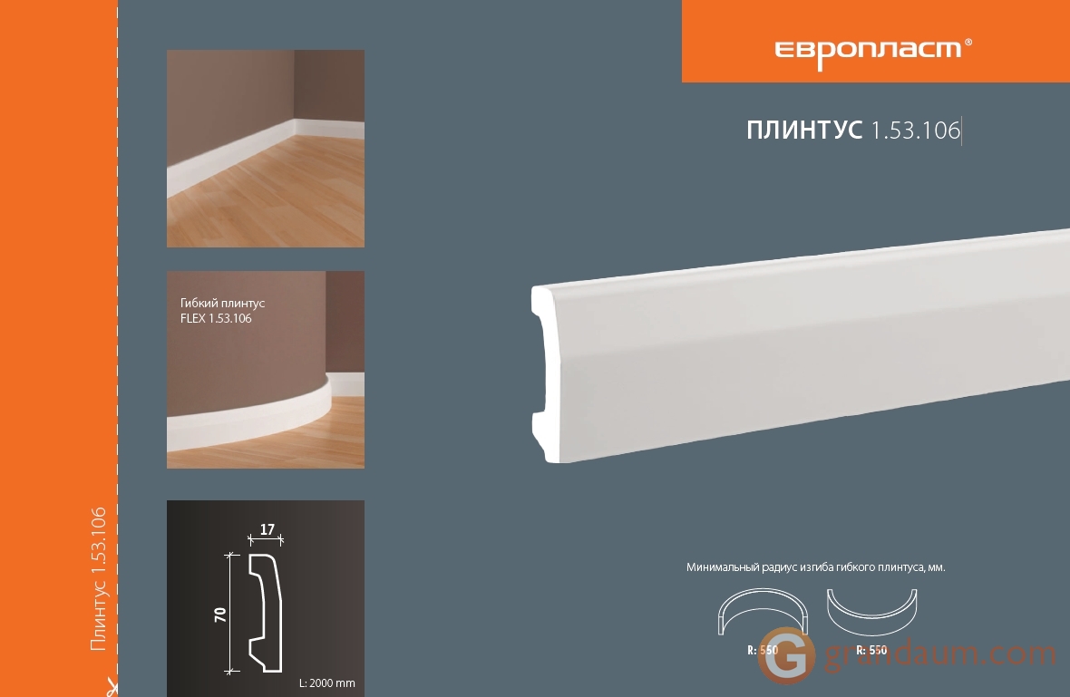 Украсьте свой интерьер пристенным гибким напольным плинтусом. Он обеспечивает плавный и гладкий переход между стеной и полом независимо от напольного покрытия, добавляя завершающий штрих интерьеру. Гибкий плинтус позволяет декорировать стены даже округлой формы. Плинтус визуально привлекателен и практичен благодаря своим ударопрочным свойствам, защищающим от повреждений. В современных модерн интерьерах, а так же в неоклассике такие профили формируют четкие линии, характерные для дизайна. Материал эластичен, при этом очень прочный и универсальный. Напольный плинтус производится загрунтованным и готовыми к покраске.