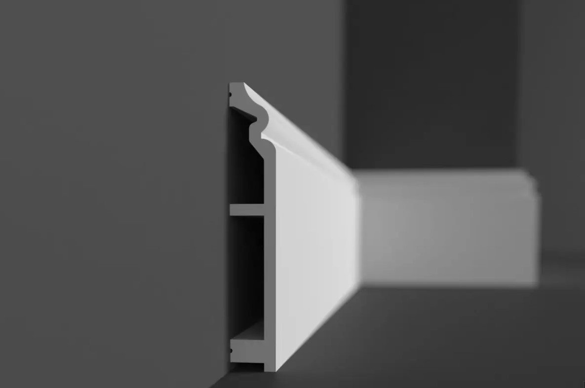 Украсьте свой интерьер пристенным гладким напольным плинтусом. Он обеспечивает плавный и гладкий переход между стеной и полом независимо от напольного покрытия, добавляя завершающий штрих интерьеру. Плинтус визуально привлекателен и практичен благодаря своим ударопрочным свойствам, защищающим от повреждений. В современных модерн интерьерах, а так же в неоклассике такие профили формируют четкие линии, характерные для дизайна. Прочный материал защищает от ударов и повреждений. Напольный плинтус производится загрунтованным и готовыми к покраске.