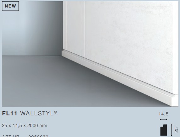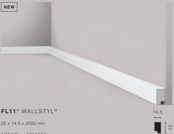 Материал из дюрополимера HDPS высокой плотности легко режется и имеет небольшой вес. Установка быстрая и точная. Кроме того, плинтус FL11 WALLSTYL® уже загрунтован, поэтому его можно сразу же покрасить в любой цвет.